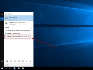 Bấm nút cửa sổ windows gõ từ khóa “create”, chọn “Create and fortmat hard disk